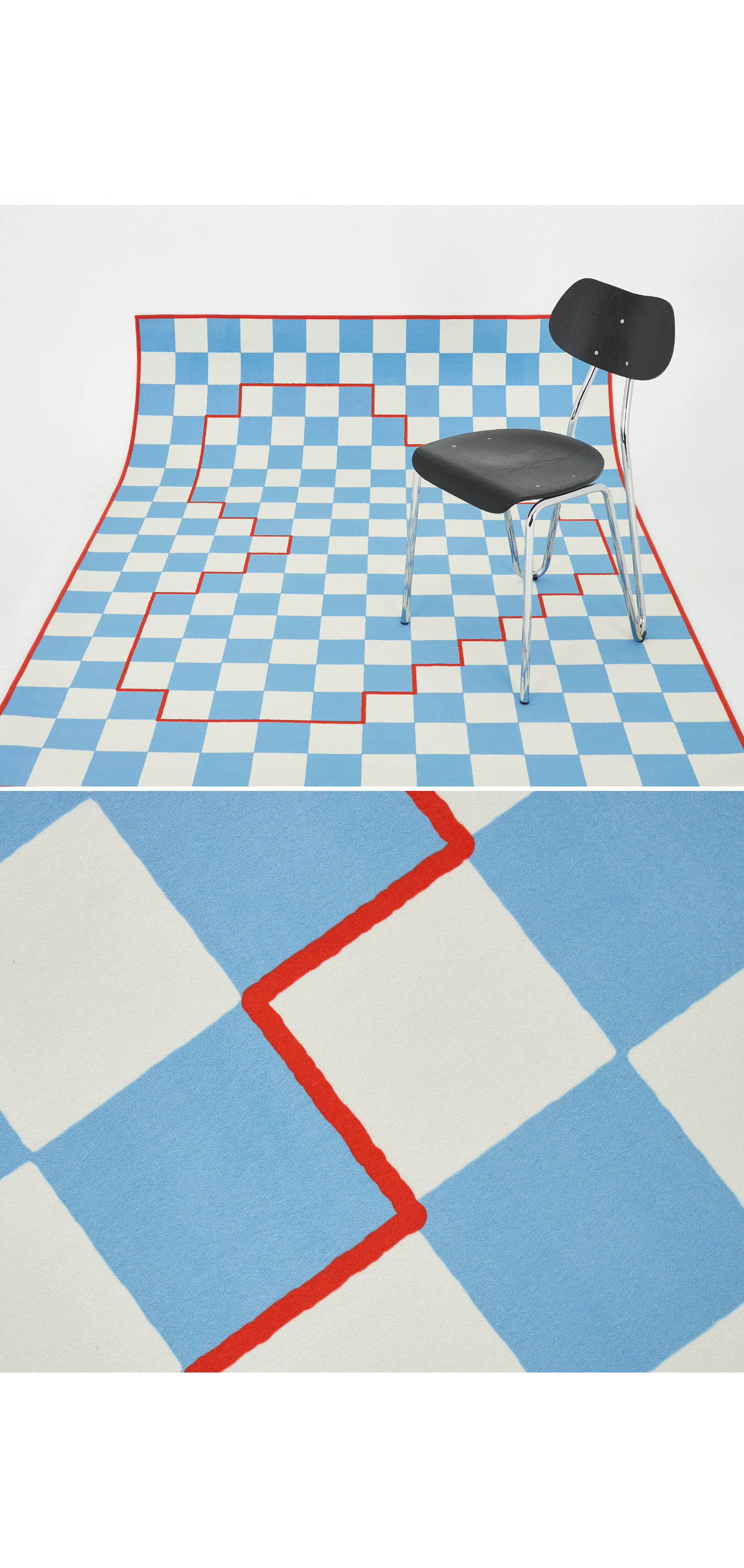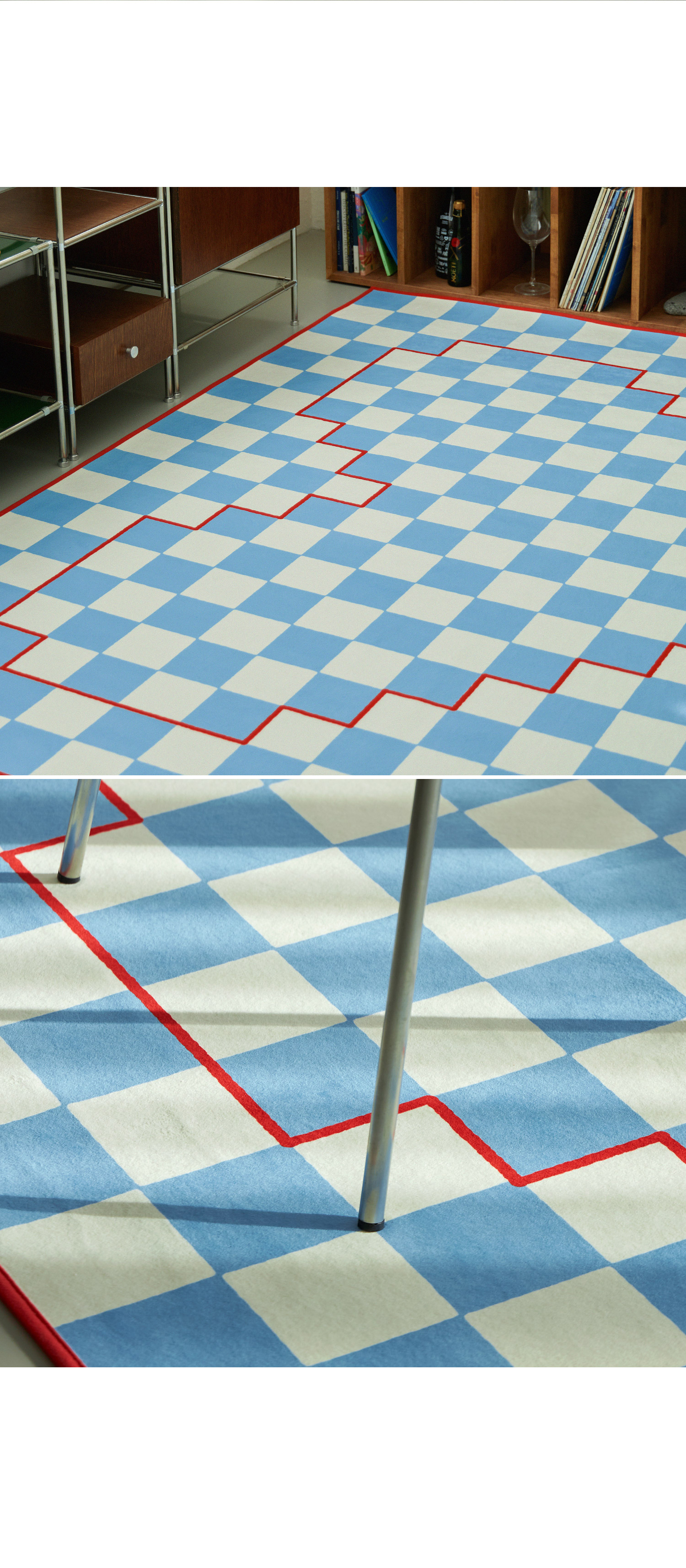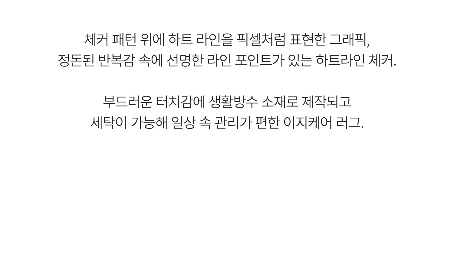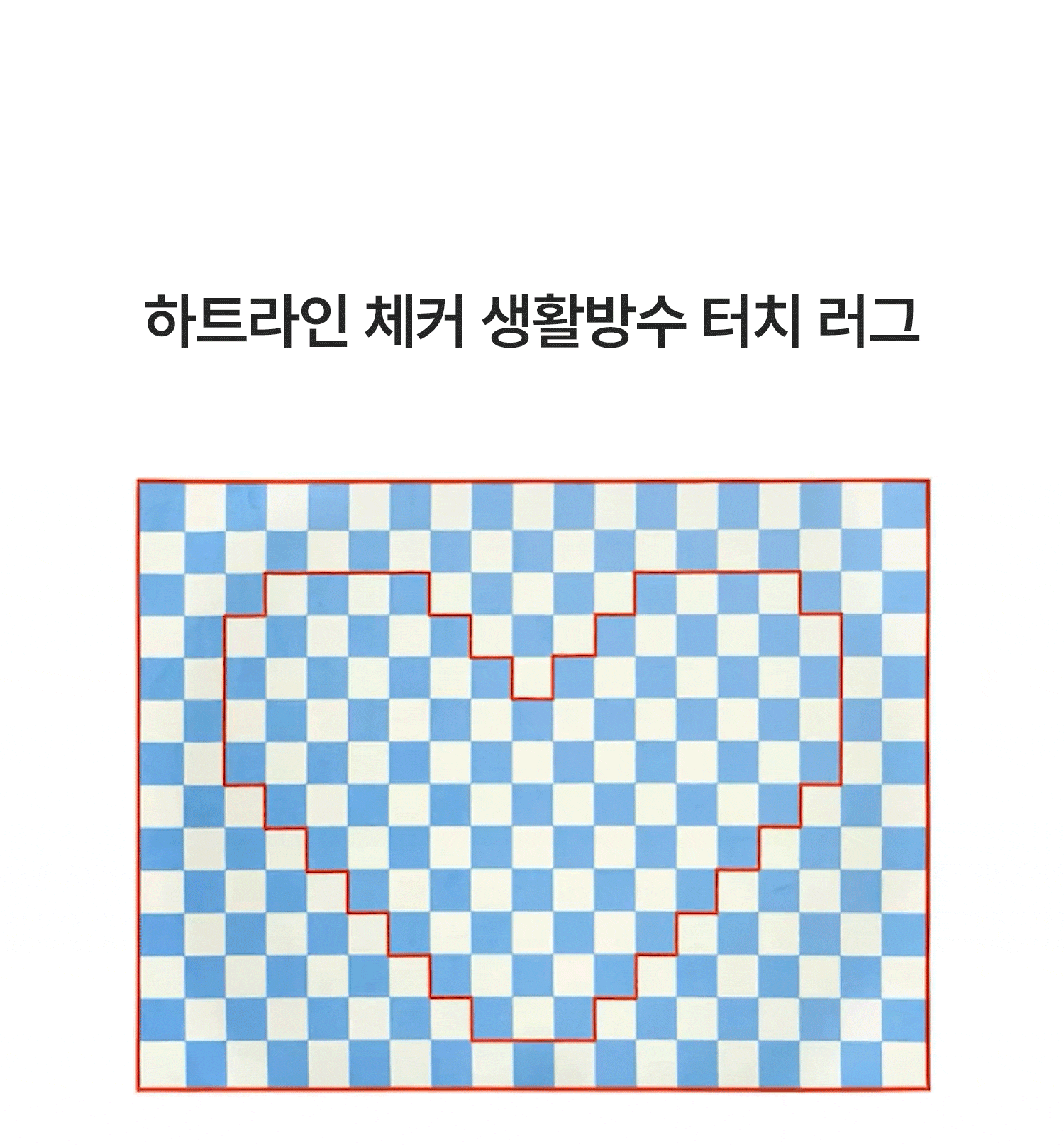 체커 패턴 위에 하트 라인을 픽셀처럼 표현한 그래픽 러그예요.