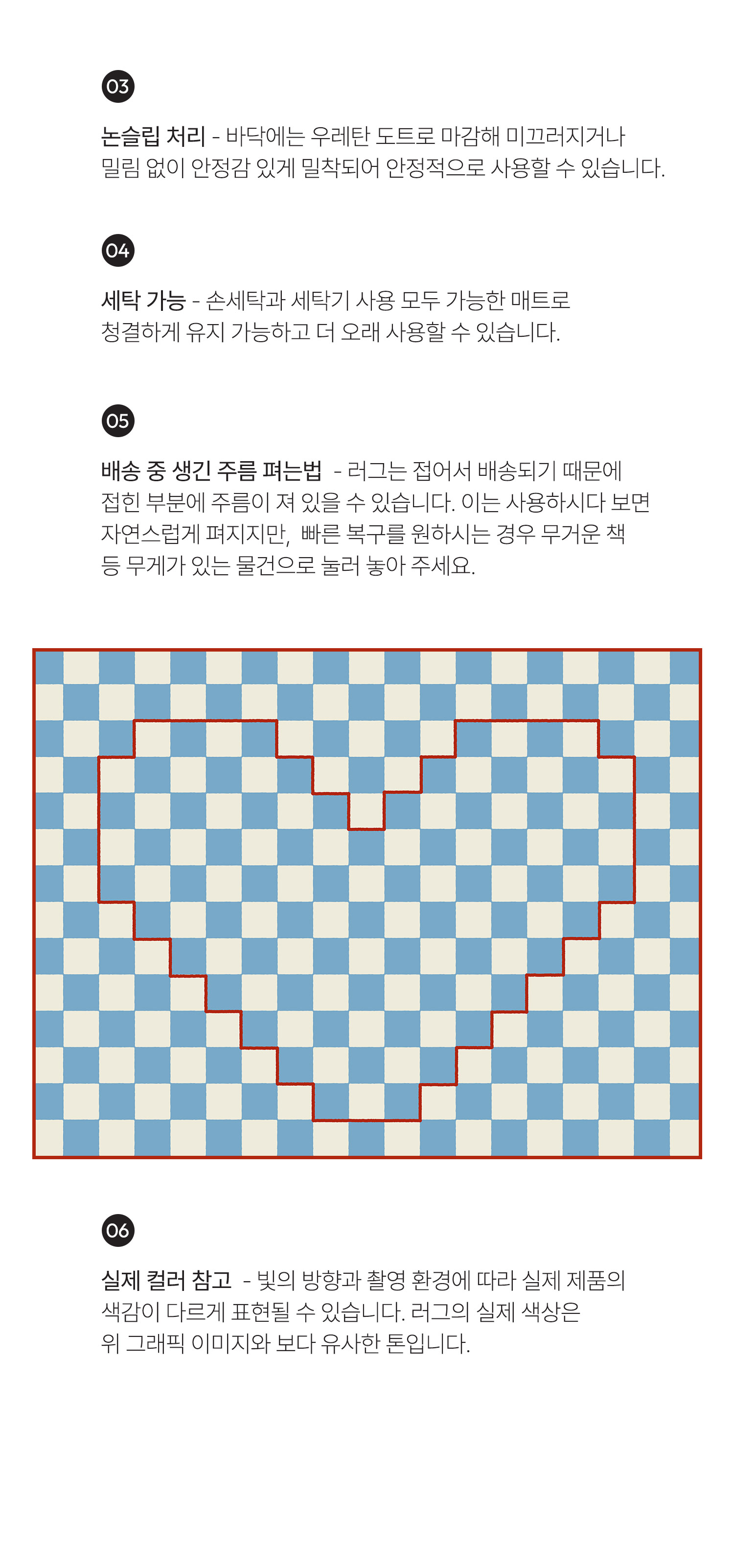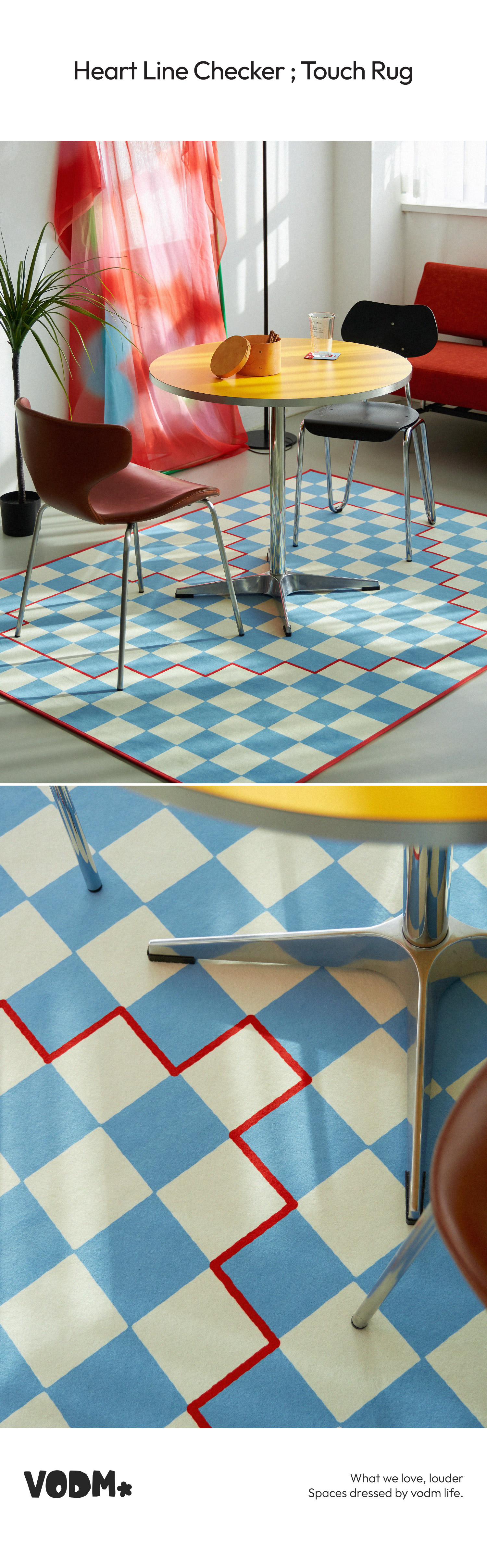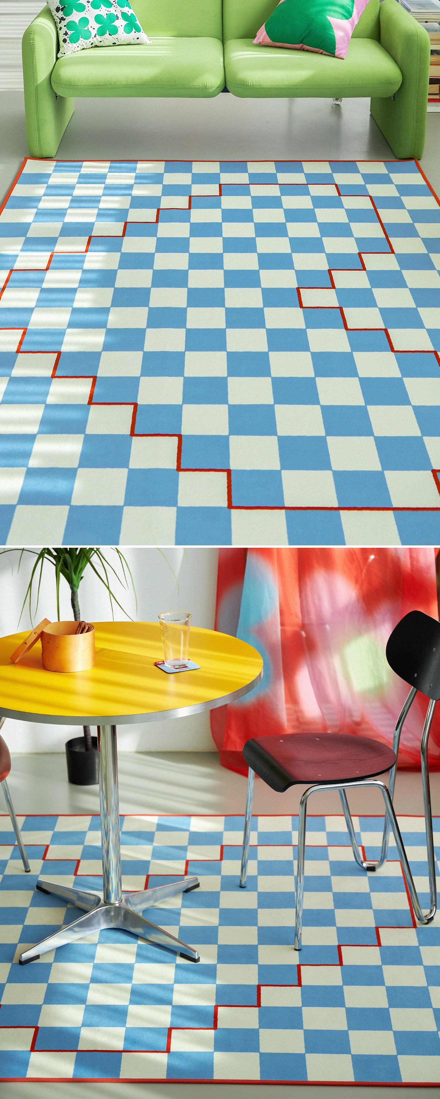체커 패턴 위에 하트 라인을 픽셀처럼 표현한 그래픽 러그예요.