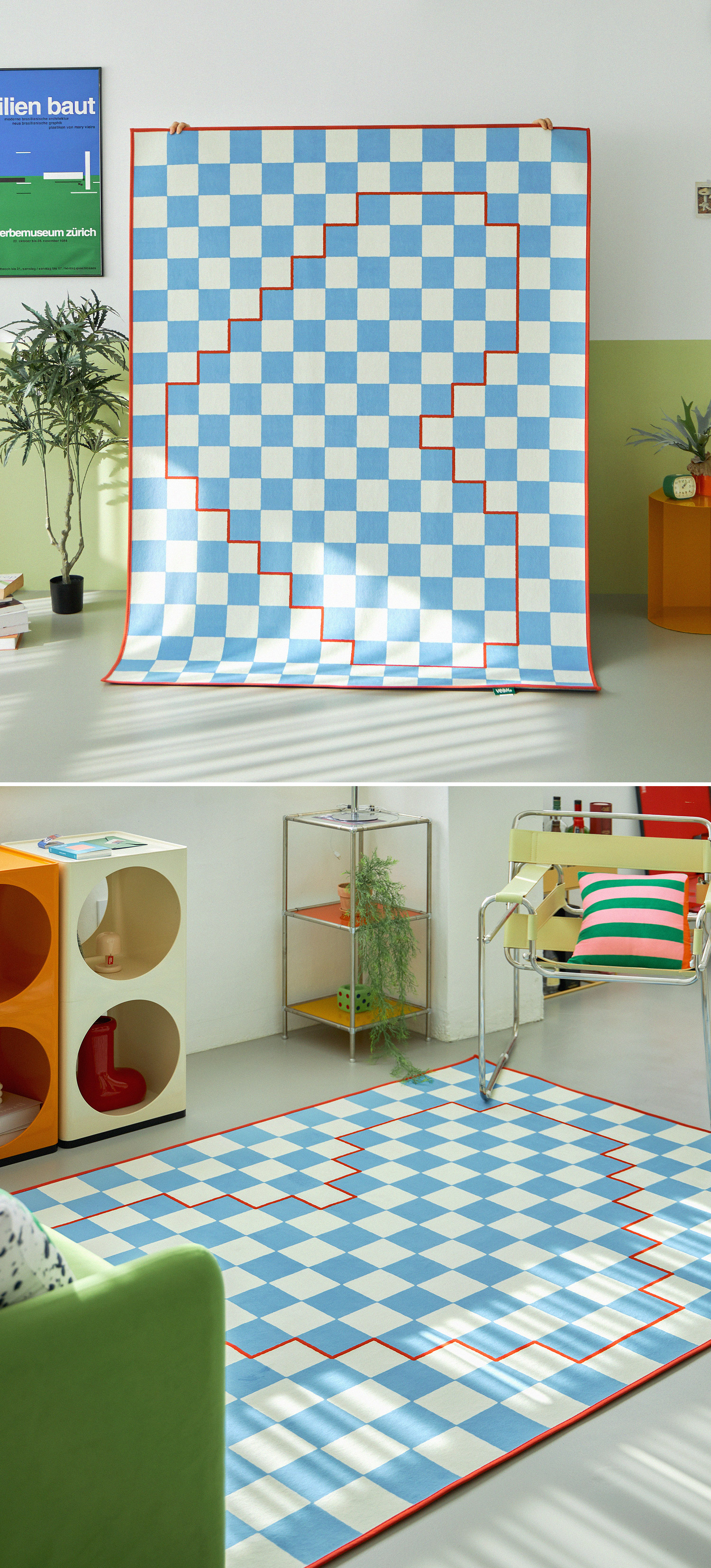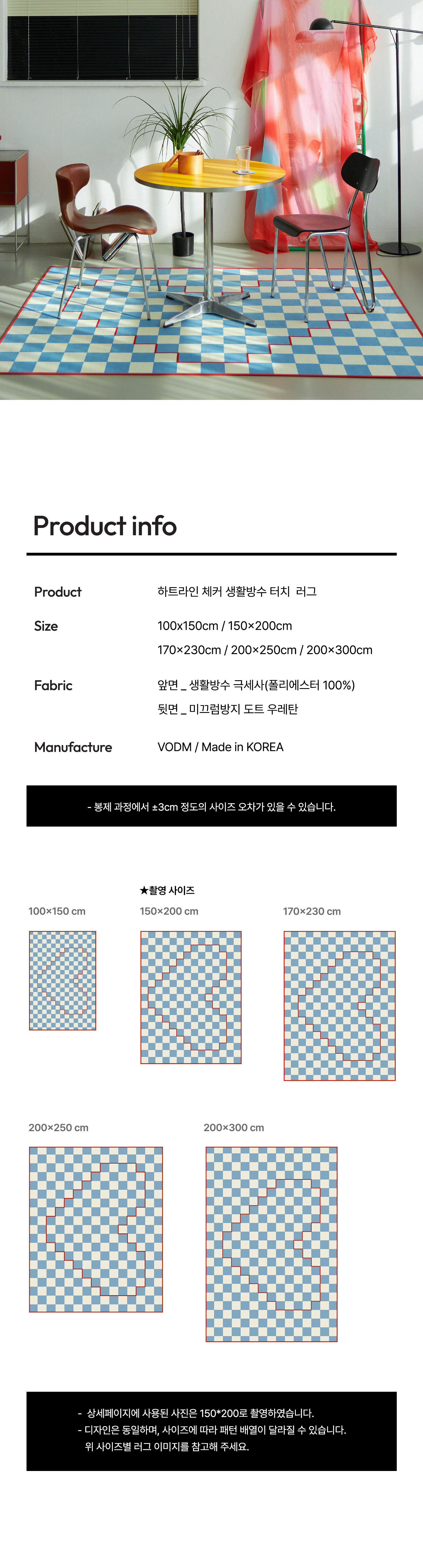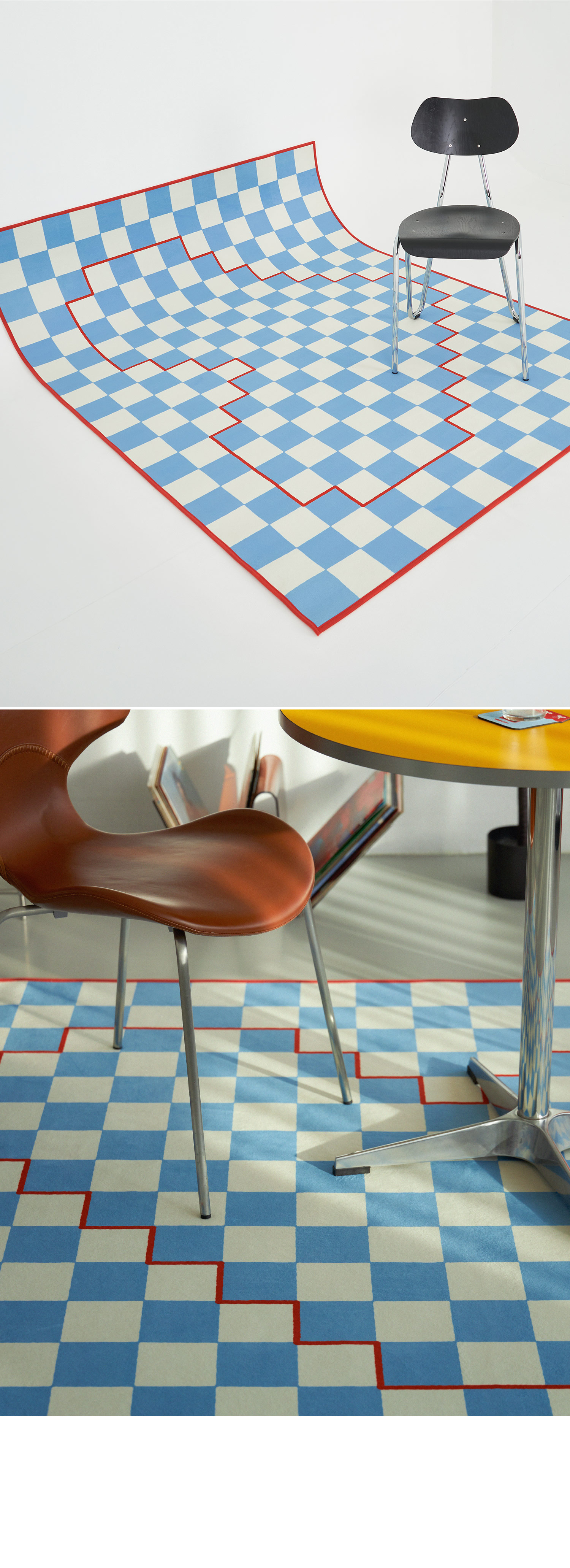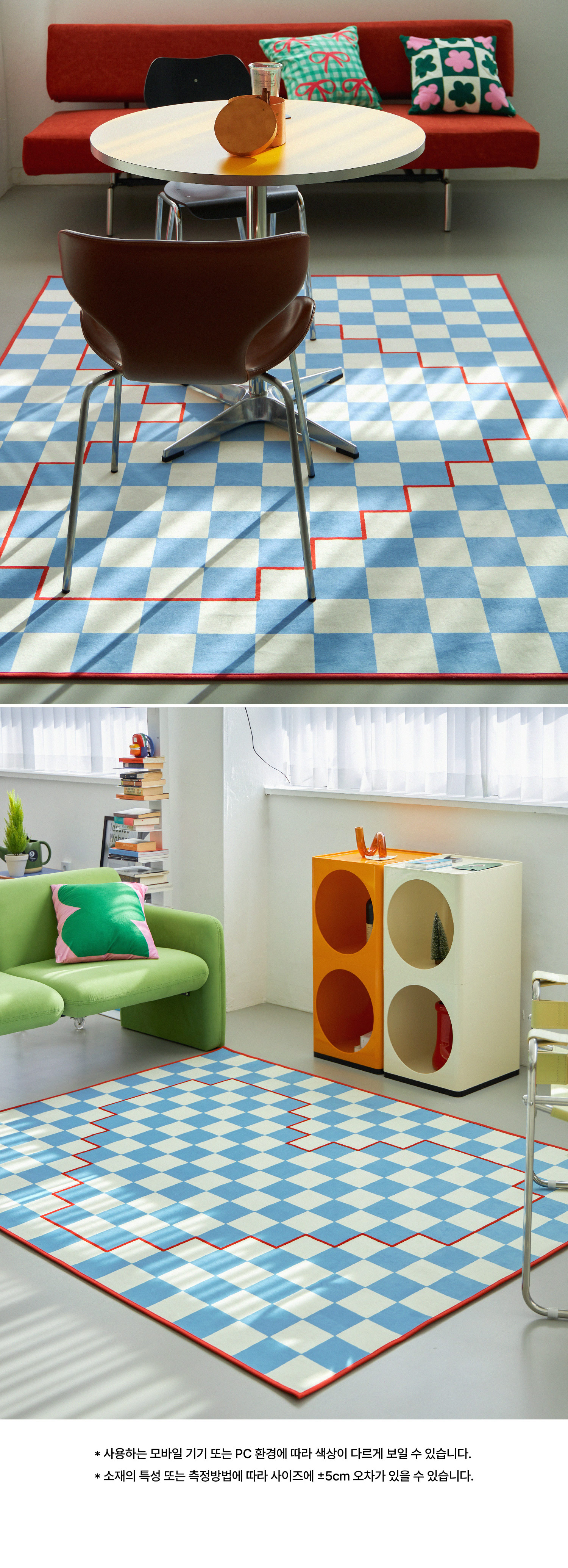 체커 패턴 위에 하트 라인을 픽셀처럼 표현한 그래픽 러그예요.
